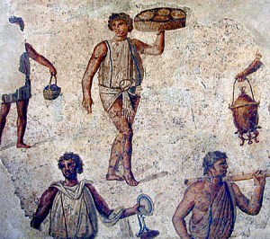 Mosaic of slaves serving at a banquet, from Carthage, 3rd century CE. Louvre, Paris. Photo by Barbara McManus